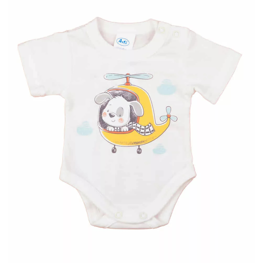 Alapvetõ ruhadarab babáknak, jól kombinálható más ruhákkal. Elején cuki Helikopteres mintával nyomott. A picik bõrére nagyon kell vigyázni hogy semmi se irritálja ez a termék is mind a legtöbb babaruhánk 100% Pamutból készült.Tisztítása nagyon könnyû.