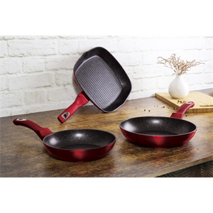 A szett tartalmaz 3 különböző méretű serpenyőt: O20*4.2 cm, O24*5.0 cm és O28*4,1 cm, valamint egy grill serpenyőt.