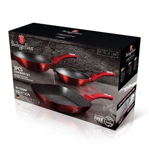 A 3 részes serpenyő szett a Metallic Line Burgundy Editiontól tökéletes választás a modern konyhák számára. Az elegáns stílus és a környezetbarát kivitelezés mellett a szett tartalmaz magában mindent, amire szükséged lehet a mindennapi főzés során. A kovácsolt alumíniumból készült serpenyők nem csak esztétikusak, de praktikusak is, hiszen a turbó indukciós talp és a 3 rétegű márvány bevonat révén akár 35% energiát is megspórolhatsz. A szett színe burgundi, ami egyedivé teszi a konyhádat és harmonikusan összefér a többi BerlingerHaus termékkel.