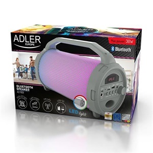 A termék jellemzői kiváló minőségű hangszóró az Adler-től Bluetooth átviteli távolság akár 10 méter FM rádió mikrofon bemenet fejhallgató bemenet USB csatlakozó AUX csatlakozó 32 GB-ig terjedő micro SD kártyák támogatása 1200mAH akkumulátor RGB LED világítás 30W zenei teljesítmény