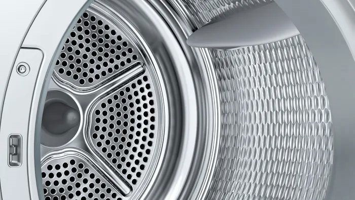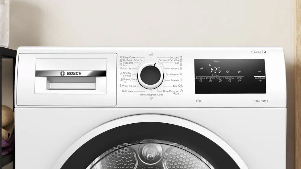 Hőszivattyús kondenzációs szárítógép – Serie4 – 8kg – Energiaosztály: E – Fekete-fehér ajtó – EasyClean kondenzátor – TouchControl kijelző – Választható szárítási fok – Vasaláskönnyítés – Kímélő szárítás – Időzíthető – Energia: 235 kWh / év