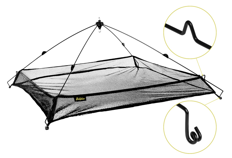 A Delphin gyártmányú csaliháló több felülmúlhatatlan előnyt kínált. Ezek közül az első a kiváló tárolhatóságot és szállíthatóságot lehetővé tévő méretei, továbbá a PE hálo használata. Ez a modell ezen kívul megemelt peremeket is kapott. A fém karok összecsukhatók,ami a horgászhelyen rendkívül gyors szerelést tesz lehetővé. A felső részén egy gyűrű található a fogantyú rögzítéséhez horoggal (nem képezi a szállítmány részét). Ennek a modellnek vitathatatlanul a leleményesen kialakított karok a nagy előnye, melynek az alsó részén "V" alakú a végén pedig spirál alakú hajtás van. Ennek a kialakításnak köszönhetően a csalihal hálót jól tudja rögzíteni, valamint horgászatkor nem tud önkényesen lecsúszni. És végül, de nem utolsósorban a csúcsminőségű csaliháló kiváló ára is kellemes meglepetésnek számít!