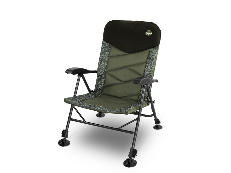 A szék karjaiban elhelyezett állítható mechanizmus lehetővé teszi a háttámla dőlésszögének változtatását a horgász igényei szerint. A fej és a nyak maximális kényelmét a sötétzöld színű extrán párnázott polár fejtámla biztosítja, amelyen a termék logója látható. A háttámlában és az ülőrészben található matrac tartós 600D anyagból készült, egyedi átlós varrással. A széleit 600D szövet borítja, szabadalmaztatott C2G terepszínben. A halfogások közötti kellemes időtöltés érdekében a szék ergonomikusan kialakított karfákkal van felszerelve, amelyek tökéletes kényelmet nyújtanak pihenés és a természetben való gyönyörködés közben.