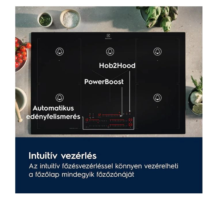 - Vezérlés funkciók: 3 lépéses maradékhő kijelzés, hangjelzés, Booster funkció, gyerekzár, Eco timer, energiagazdálkodás, hőmegtartás, Hob2Hood vezérlés, különálló zóna időzítő, billentyűzár (key-lock), baloldali „Bridge” funkció, percszámláló, szünetelés, SenseCook Boil, SenseCook Fry sütés, hang ki