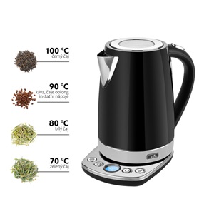 * Elektronikus szabályozás beállítható hőmérséklettel 30 – 100 °C; Hőmérséklet 40, 50, 60, 70, 80, 90, 100 °C-ra szabályozható (ideális a zöld tea, instant kávé, stb. készítéshez)