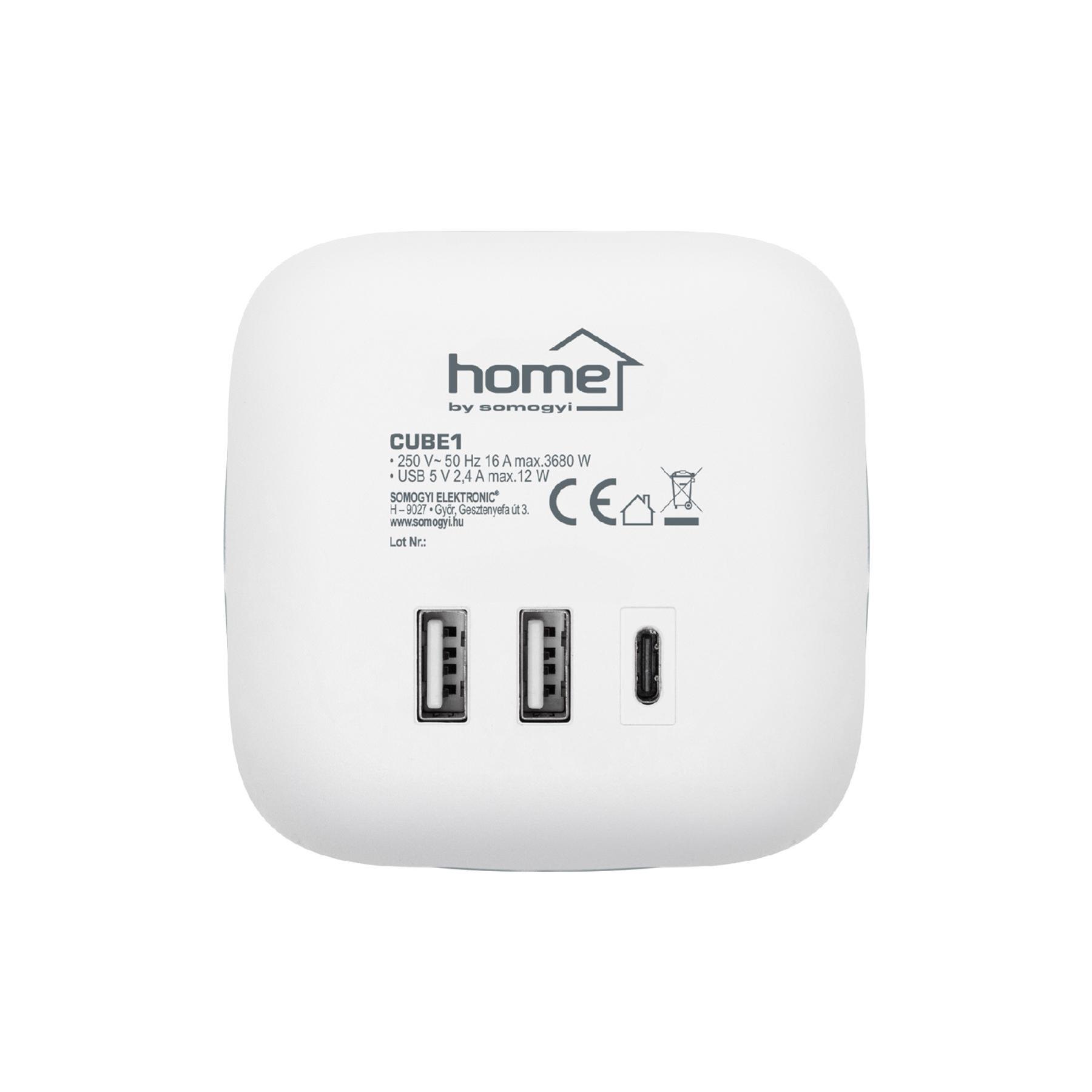 Home CUBE1 kocka elosztó USB töltővel, 3 aljzat gyermekvédelemmel, 1db USB C, 2db USB A, max. 3680 W