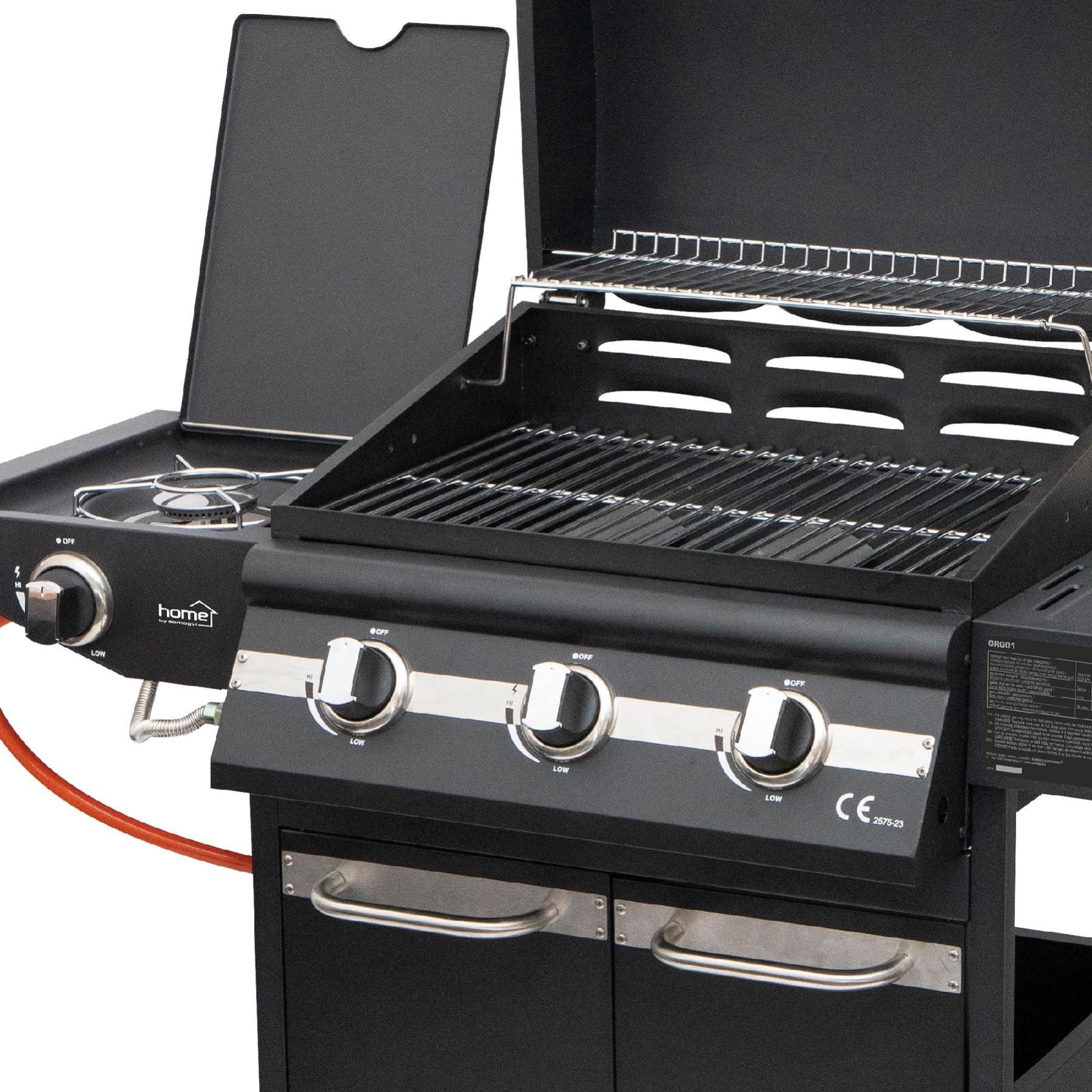 Home GRG01 gázgrill, 3 főégővel, 1 oldalégővel, 3,2 kW teljesítmény égőnként, nyomásszabályozó készlettel