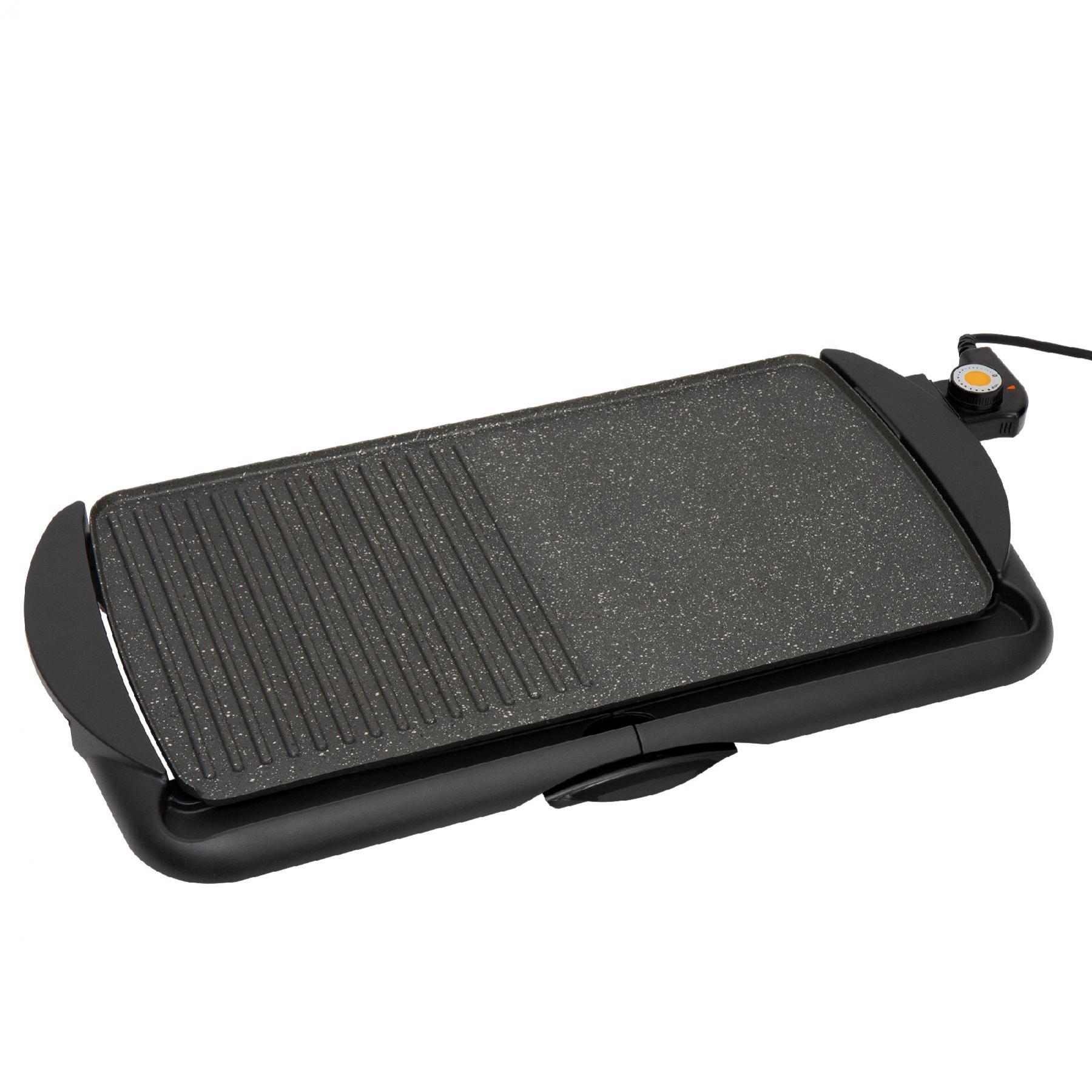 A grill beállítható sütési hőmérséklettel rendelkezik, így könnyen alkalmazkodik a különböző ételek igényeihez. A tapadásmentes bordázott vagy sima felületek kiváló eredményt és változatosságot nyújtanak a grillezett ételekben. A rendkívül könnyen tisztítható kialakítás, a kivehető zsírgyűjtő fiók és a grillezőfelület 52 x 26,5 cm-es mérete maximális kényelmet biztosít a használat során. A grill stabil műanyag állványának gumilábai gondoskodnak a készülék biztonságos elhelyezéséről, míg a hőálló műanyag fogantyúk könnyű és biztonságos mozgatást tesznek lehetővé.