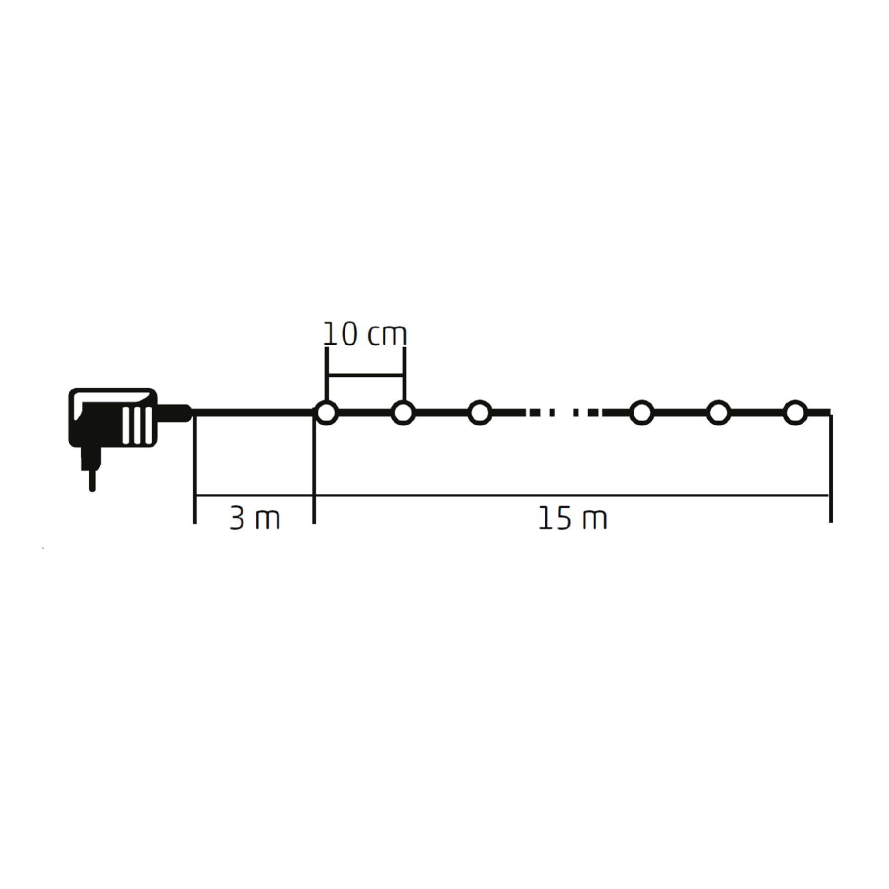 A 15 méter hosszú füzér és a 3 méteres tápvezeték elegendő rugalmasságot biztosít a tökéletes elhelyezéshez. A LED-ek közötti 10 cm-es távolság egyenletes fényeloszlást garantál. A fényfüzér tápellátásáról kültéri IP44 hálózati adapter gondoskodik, amely biztonságos és megbízható működést nyújt.