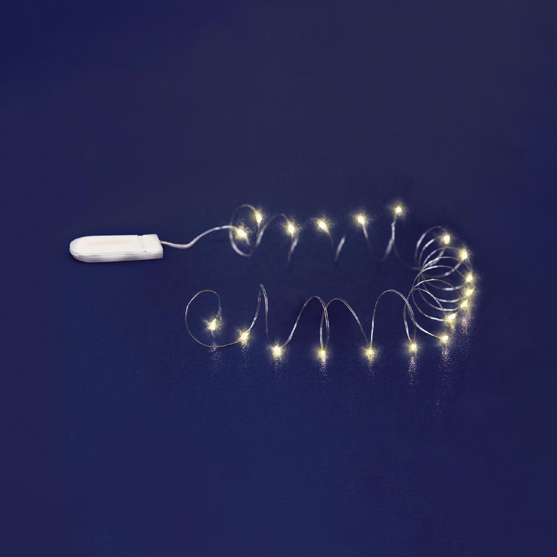 Home MLF 26/WW micro LED-es fényfüzér, 2 m / 20 db melegfehér micro LED, állófényű, átlátszó vezeték, időzíthető, gombelemes, lapos elemtartó, beltéri kivitel
