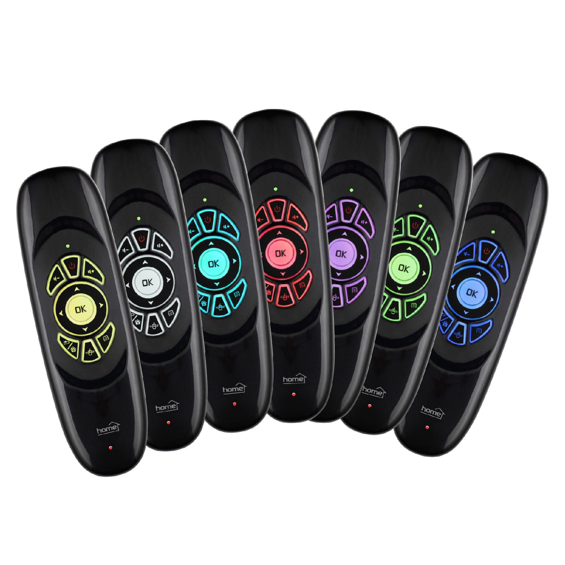 A Home URCAIR2 SMART távirányító kompatibilis az okos TV-kkel, TV box-okkal, média lejátszókkal, játék konzolokkal, projektorokkal, számítógépekkel, notebookokkal, mini PC-kkel, táblagépekkel és okostelefonokkal. A beépített háromtengelyes giroszkóp mozgásérzékelő pontos és könnyű irányítást biztosít. Az angol QWERTY billentyűzet 46+11 gombja hét különböző színben világít, így sötétben is egyszerű a használat.