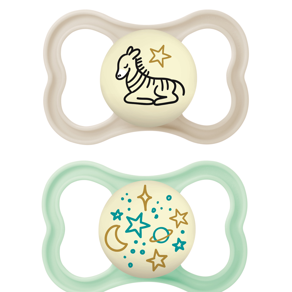 Az extra vékony és rugalmas szívóka lehetõvé teszi a zárt szájtartást, hogy a babák természetes módon tudják becsukni a szájukat cumizás közben. Ez a fogaknak elegendõ helyet hagy a normál növekedéshez. Az extra nagy szellõzõlyukaknak köszönhetõen különösen kíméletes a babák érzékeny bõréhez. A cumi gombja világít a sötétben.