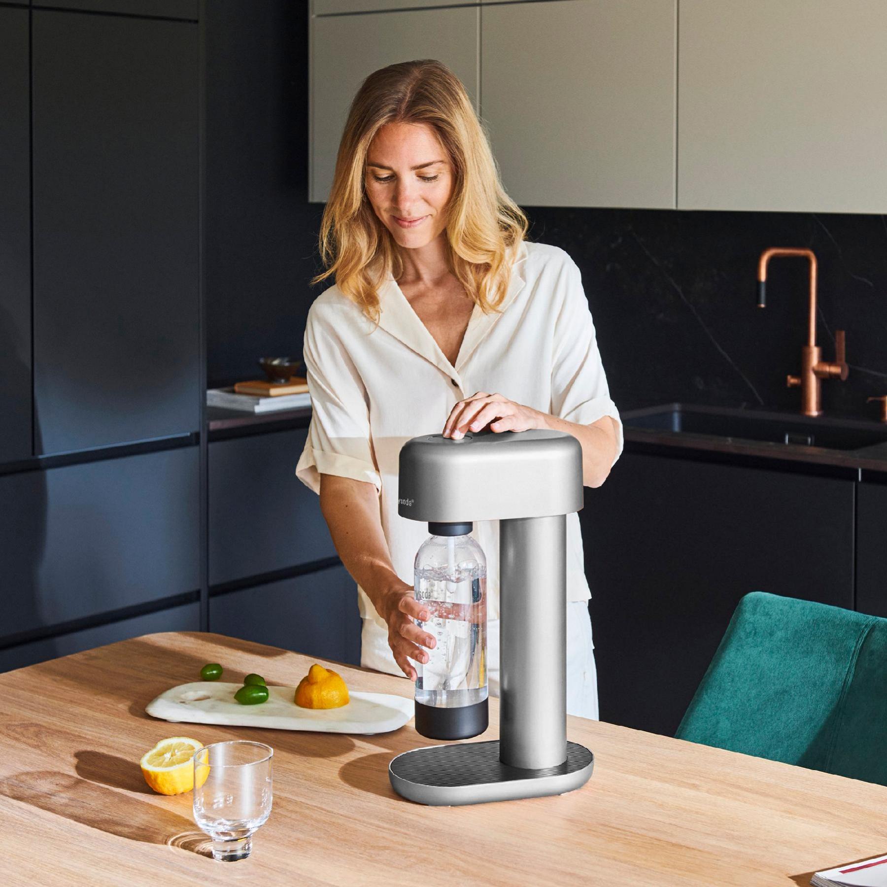 Az elegáns ezüst színű készülék teste robusztus, hosszú élettartamú alumíniumból készült, ami nemcsak tartósságot, hanem kifinomult megjelenést is biztosít. A szett tartalmaz egy 0,5 literes és egy 1 literes újrafelhasználható vizes palackot, valamint egy CO2 palackot, így azonnal kezdheti a használatot.