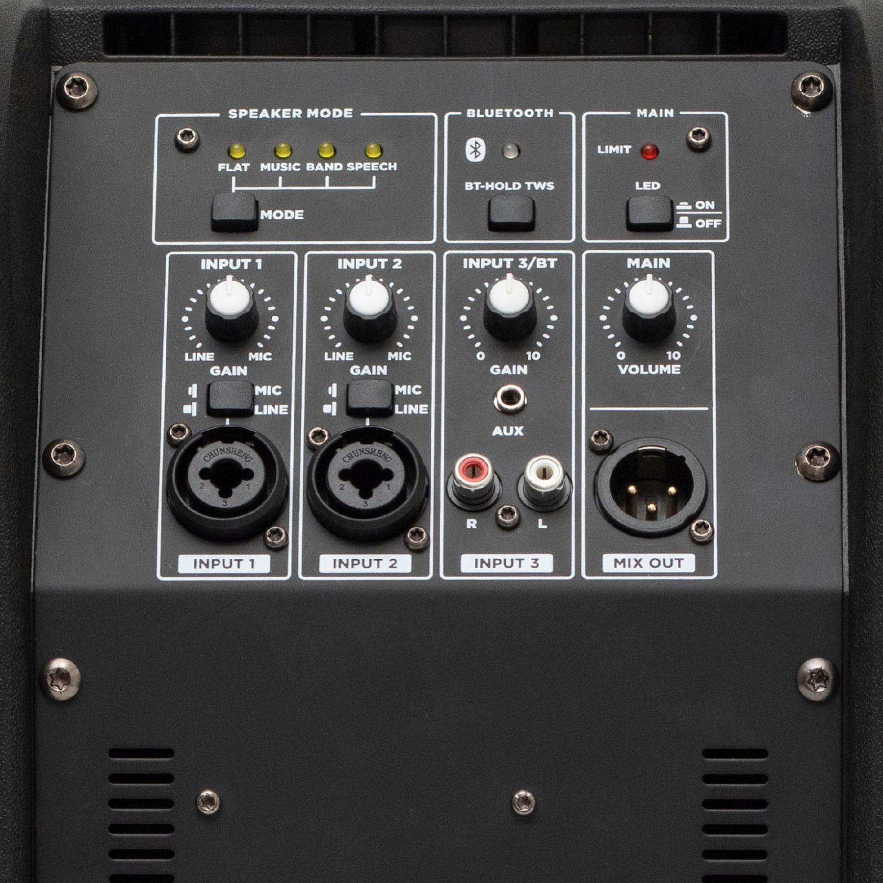 A rendszer Bluetooth TWS funkcióval rendelkezik, így két azonos modell vezeték nélkül is összeköthető, valódi sztereó hangélményt teremtve. A túlvezérlést jelző LED figyelmeztet, ha a hangerőhatáron túlra kerülne a rendszer.