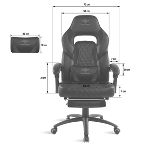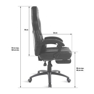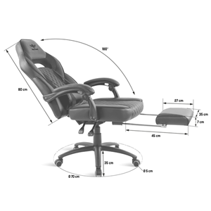 ERGONÓMIA Hintázási funkció: Nem Magasságállítás Igen, 7 cm elmozdulás Dőlésszögbeállítás 90-160°. A háttámla dőlésszögéhez igazodó, csuklós kartámaszok A párna ágyékpárnákat tartalmazza Behúzható lábtámasz (35x 27 x 7 cm) ÜLÉS Szélesség: 56 cm Mélység: 54 cm Minimális magasság: 49 cm Maximális magasság 56 cm HÁTTÁMLA Magasság 80 cm Vállszélesség 56 cm KARFA Méretek 39 x 7 x 3 cm Fix karfák A háttámla dőlésszögét követő csuklós karfák ALAP Fém alap Átmérő 70 cm Dupla PU / 360° / csúszásgátló / antisztatikus görgők Maximális súly 120 kg DESIGN Méretek 128-119 x 70 x 70 cm Súly 21 kg Szín Fekete III. osztályú henger Fém szerkezet Műbőr bevonat